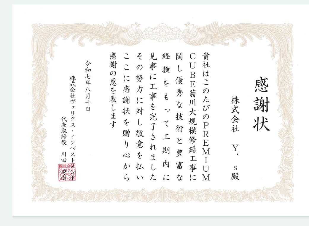 表彰状 2025/10/02 こんにちは! 最近完工した元請案件で管理会社様より表彰を頂きました! 大規模修繕工事の満足度アップは管理組合様、オーナー様の声をしっかり聞いて実現する❗️に限ります❗️ 只今繁忙期につきバタバタしておりますが一つ一つ丁寧に仕上げて満足度向上に努めたいです❗️ 管理組合様!ビルオーナー様! お見積りは無料ですのでご連絡お待ちしておりますm(__)m